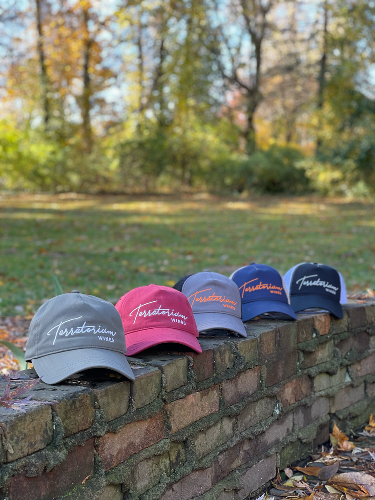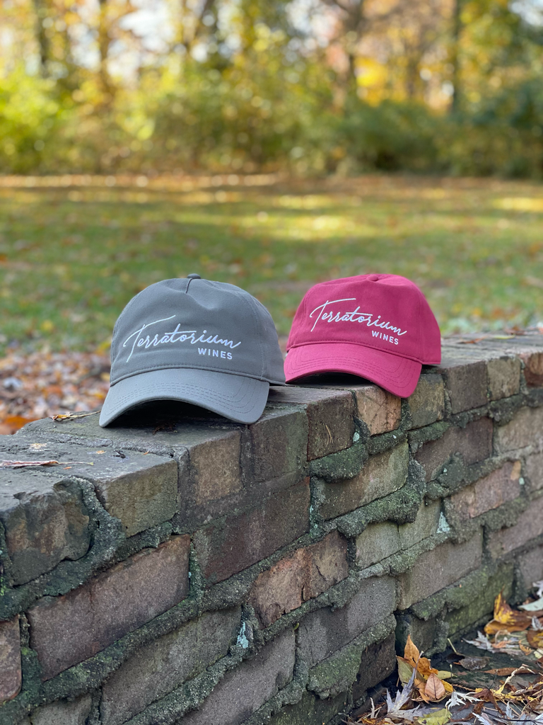- Crimson cotton twill with white embroidered Terratorium wordmark